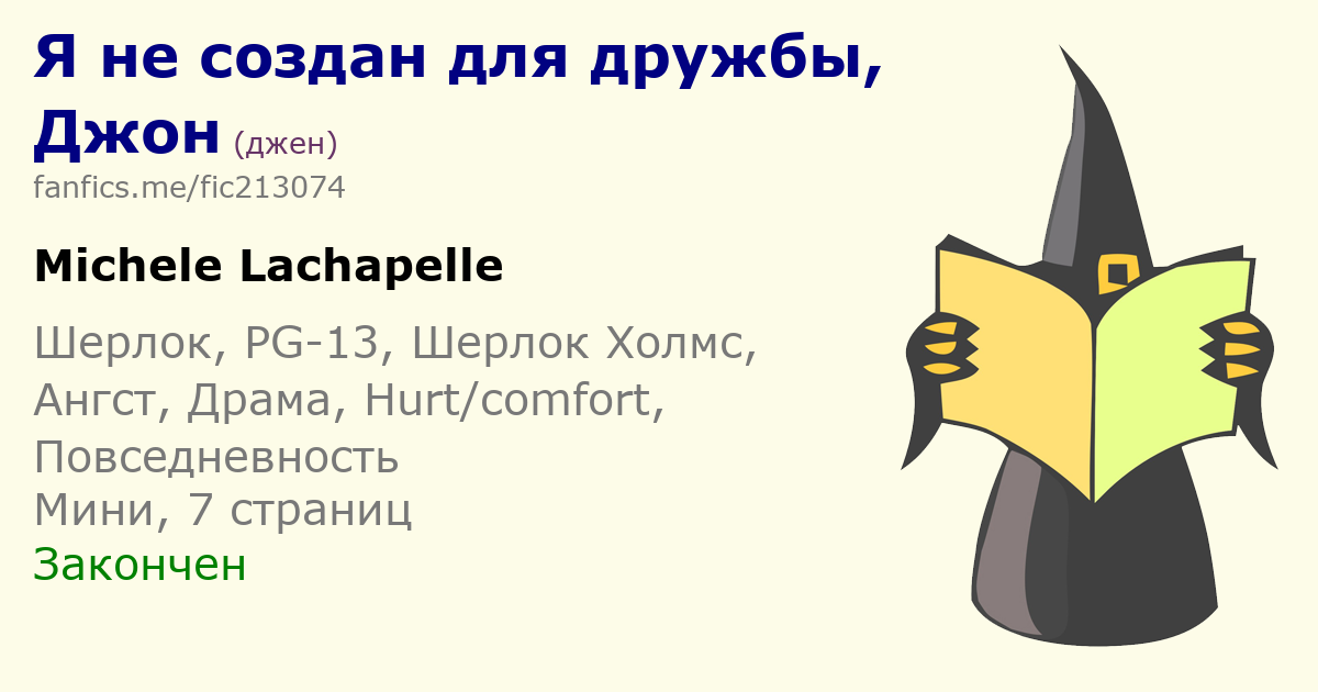 <a href="https://fanficsgh.ru/fic213074"><b>Я не создан для дружбы, Джон</b></a> (джен)<br>Автор: <a href="https://fanficsgh.ru/user923022">Michele Lachapelle</a><br>Фандом: <a href="https://fanficsgh.ru/fandom9">Шерлок</a><br>Персонажи: <a href="https://fanficsgh.ru/character388">Шерлок Холмс</a>, <a href="https://fanficsgh.ru/character389">Джон Хэмиш Ватсон</a><br>Рейтинг: PG-13<br>Жанр: Ангст, Драма, Hurt/comfort, Повседневность<br>Размер: Мини | 27 964 знака<br>Статус: Закончен<br>События: Броманс<br>Саммари:<br>Уж поверь, мне прекрасно это известно. Слишком грубый, жестокий, циничный, равнодушный к чувствам других. Да и если подумать... Разве нужен кому-то в друзьях столь невозможный, ядовитый брюзга?